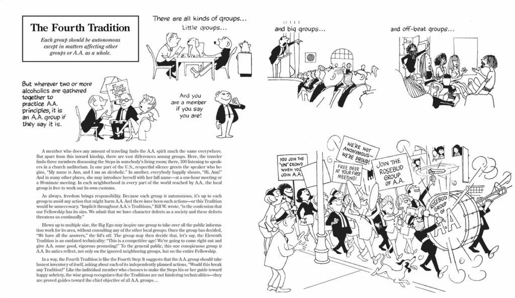 With respect to its own affairs, each A.A. group should be responsible to no other authority than its own conscience. But when its plans concern the welfare of neighboring groups also, those groups ought to be con sulted. And no group, regional committee, or individual should ever take any action that might greatly affect A.A. as a whole without conferring with the trustees of the General Service Board. On such issues our common wel fare is paramount.
