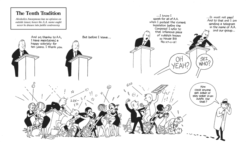Alcoholics Anonymous has no opinion on outside issues; hence the A.A. name ought never be drawn into public controversy